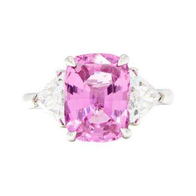 4.66 carat Pink Sapphire Cushion-Shape set with Trillion Side Stones in Platinum – No Heat