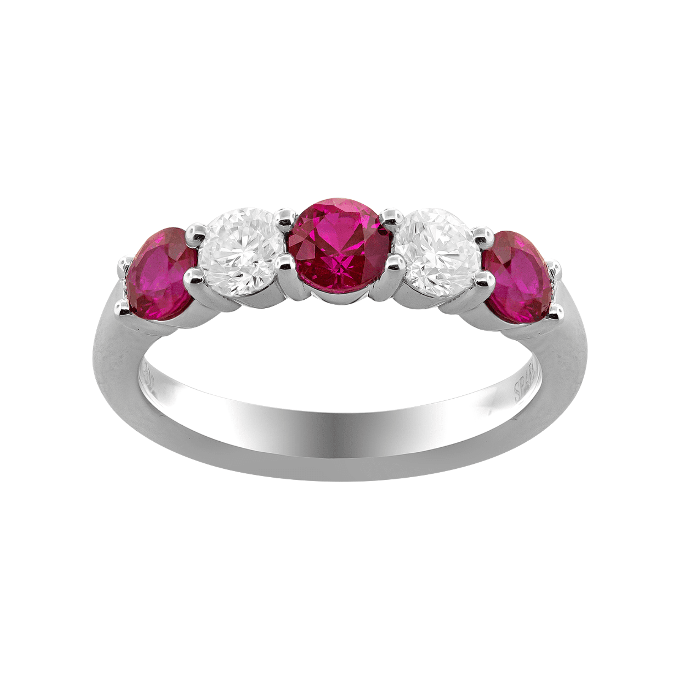 Spark Creations three (3) Round Brilliant cut Ruby and two (2) Round Brilliant cut Diamond Alternating Ring in Platinum