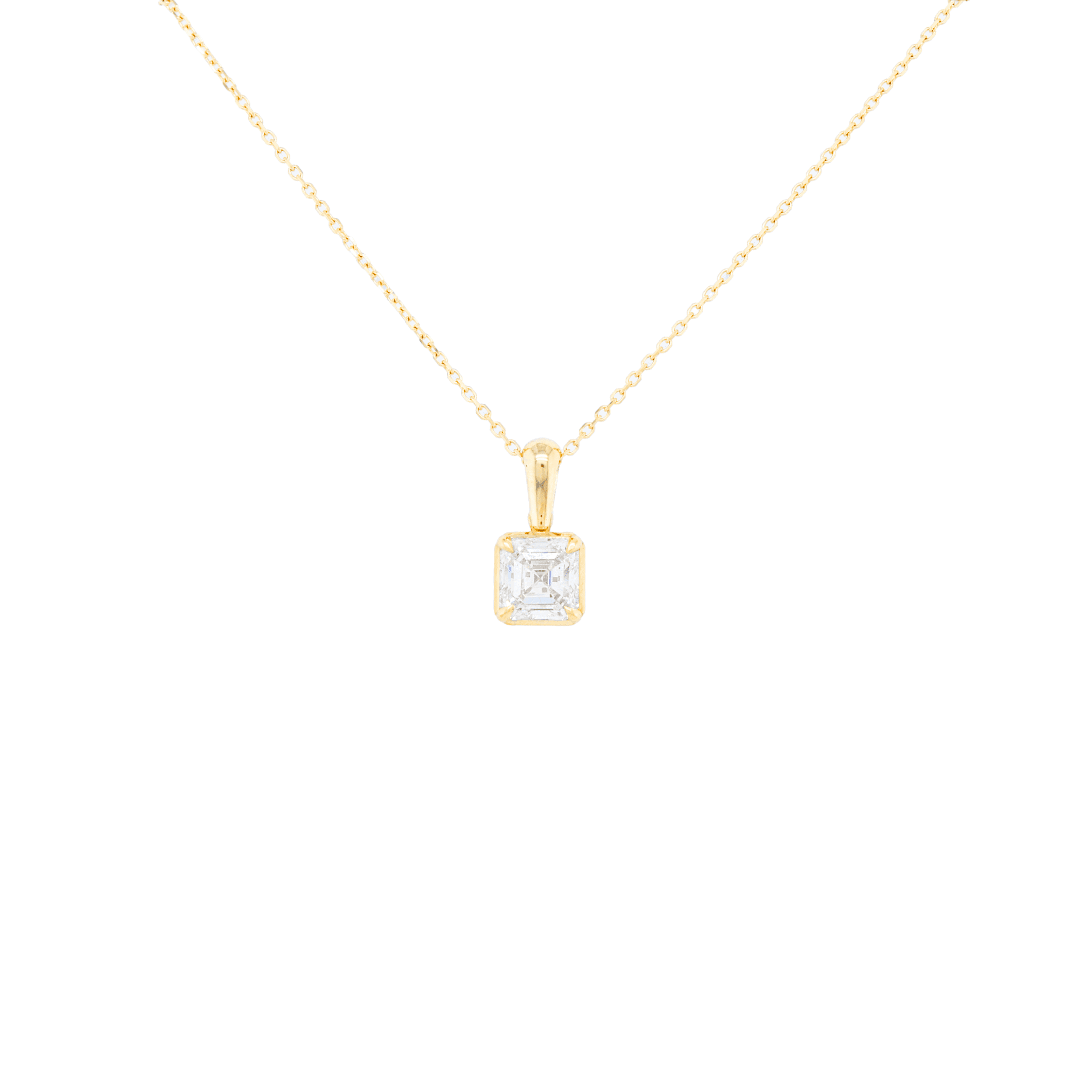 Marshall Pierce and Company Chicago curated 1.02 carat Asscher cut E Color, SI Clarity GIA Certified Diamond Solitaire Pendant Necklace in 18K Yellow Gold