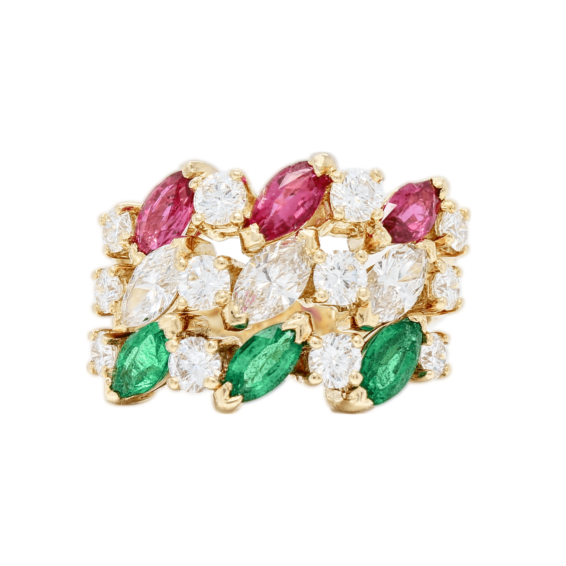 1.20 carat Three Row Ring with Ruby, Emerald and Diamonds in Yellow Gold