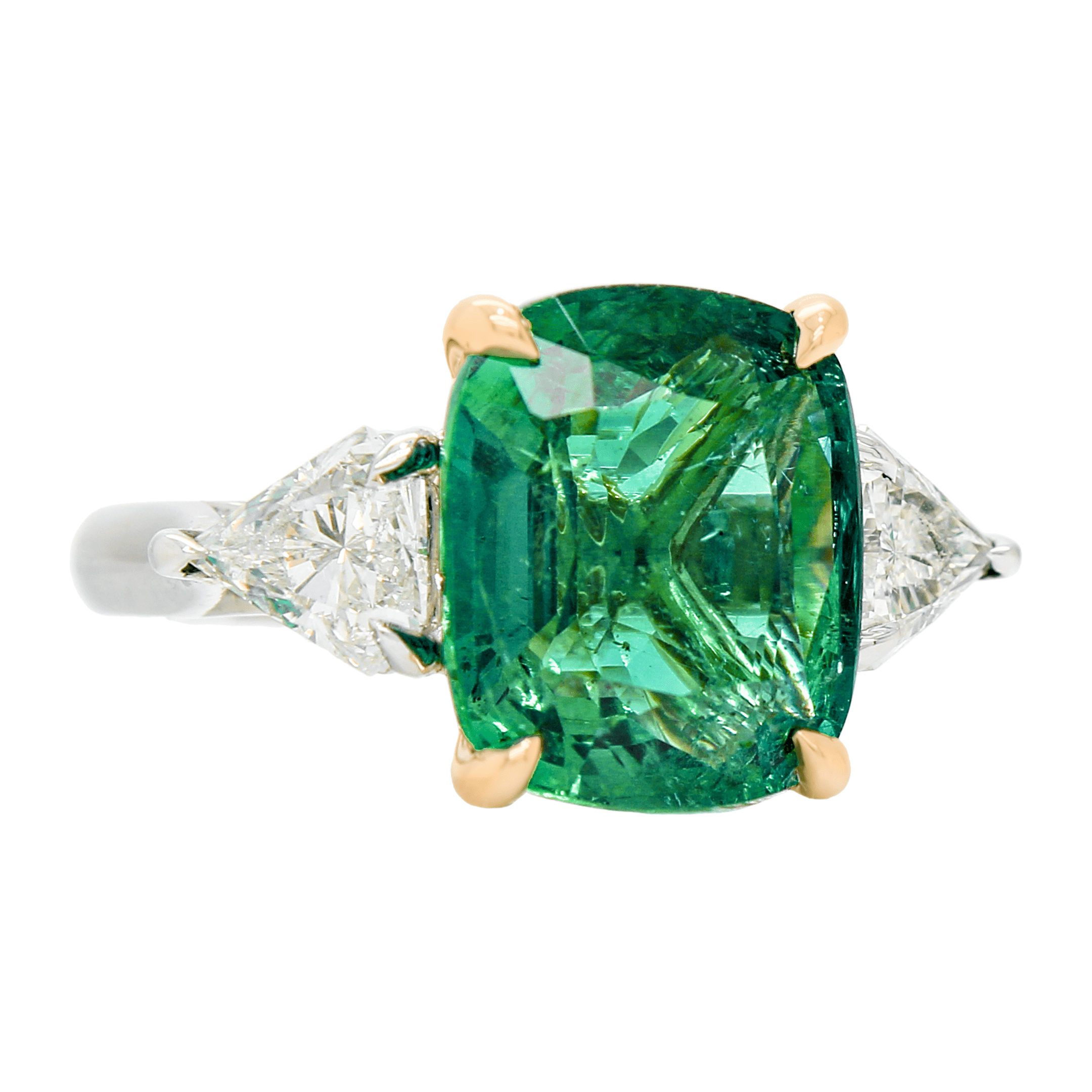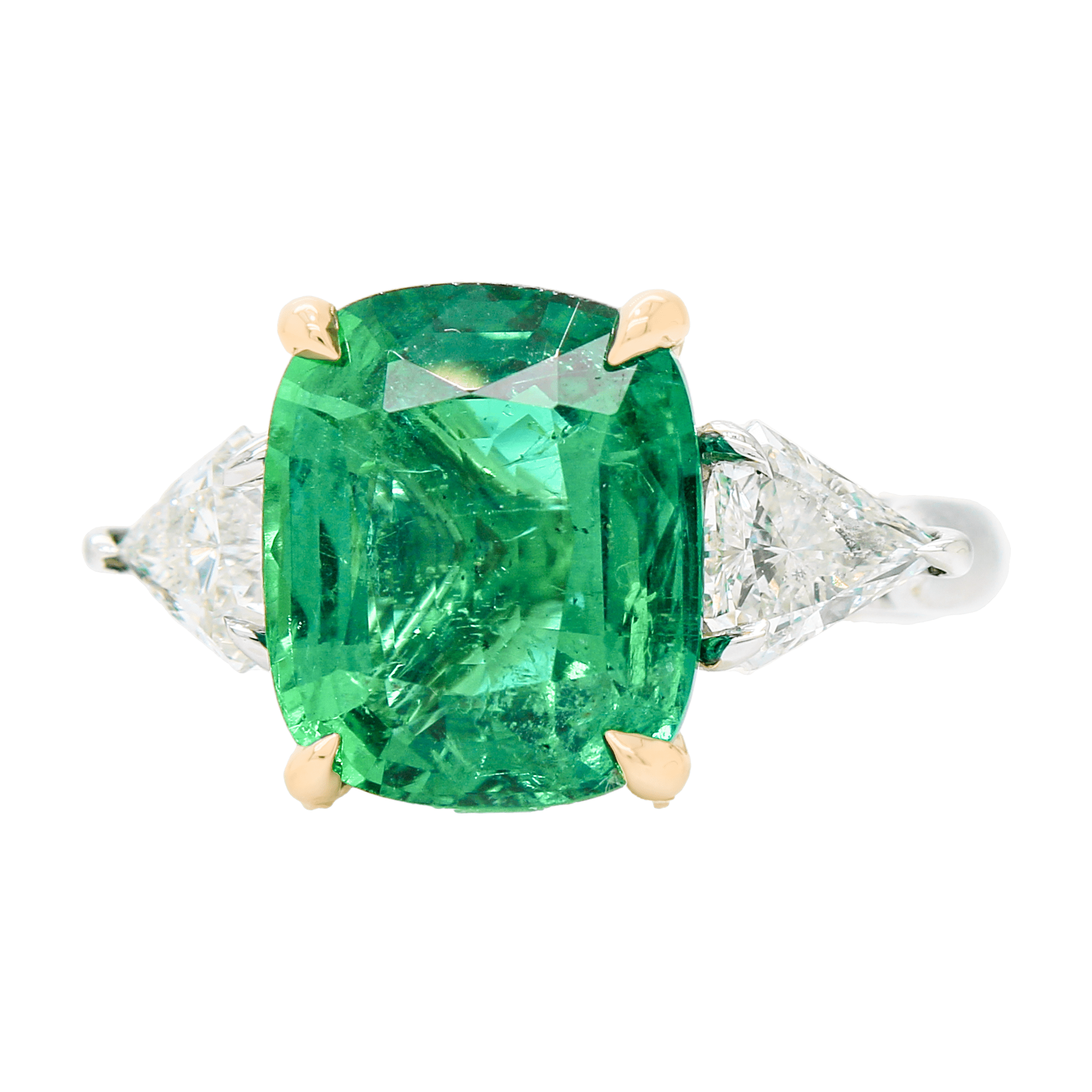 Marshall Pierce and Company Chicago curated Classic Three Stone Ring in Platinum and 18K Yellow Gold, center stone set with a C. DUNAIGRE CERTIFICATE 5.93 carat Cushion cut Zambian Emerald and with two (2) Shiled cut Diamonds weighing a total of 1.20 carats. C. DUNAIGRE CERTIFICATE: CDC2203950