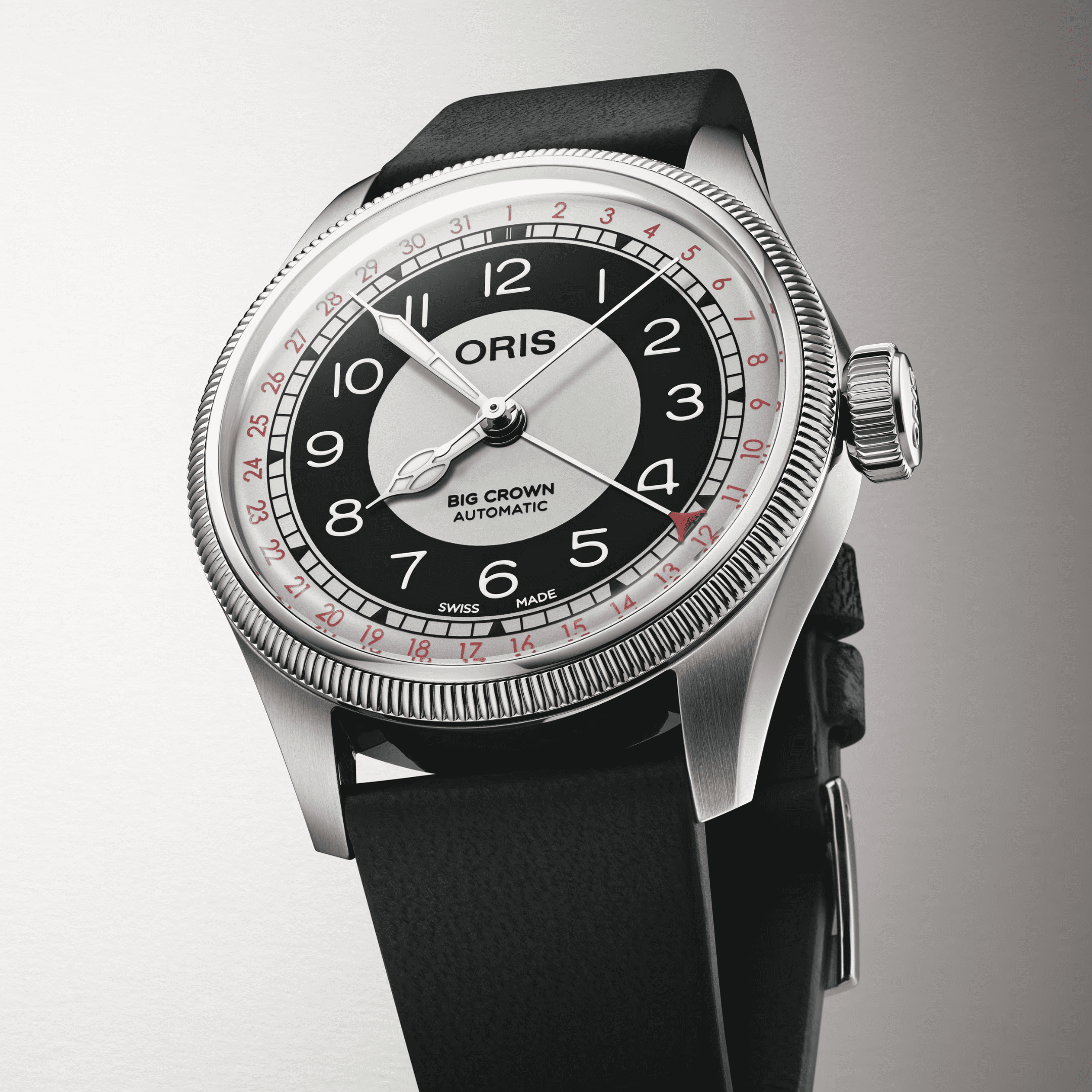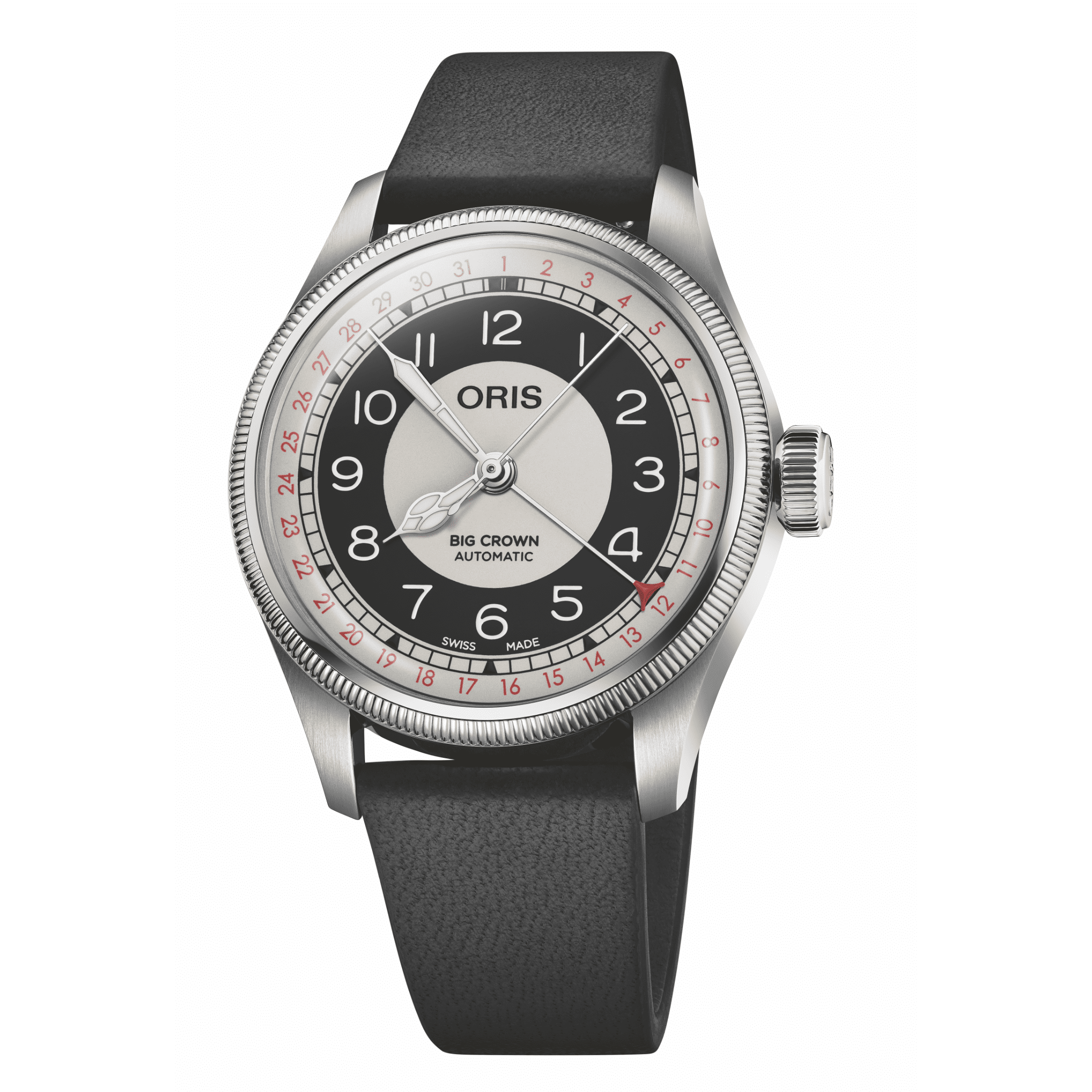 Oris Big Crown Pointer Date White/Grey/Black Dial 40mm in stainless steel case, 50m Water Resistance, 41 Hours Power Reserve, Centre hands for hours, minutes and seconds, date centre hand, instantaneous date, date corrector, fine timing device and stop-second, Caliber 754-1 , Automatic, Black Leather Strap