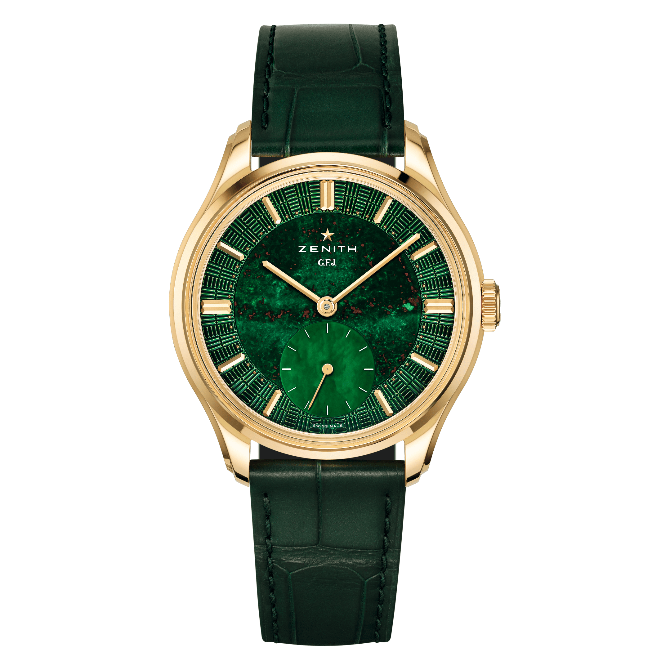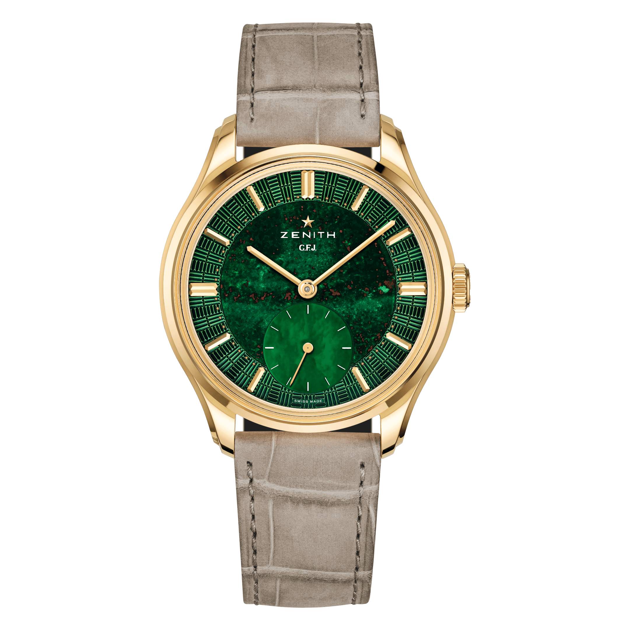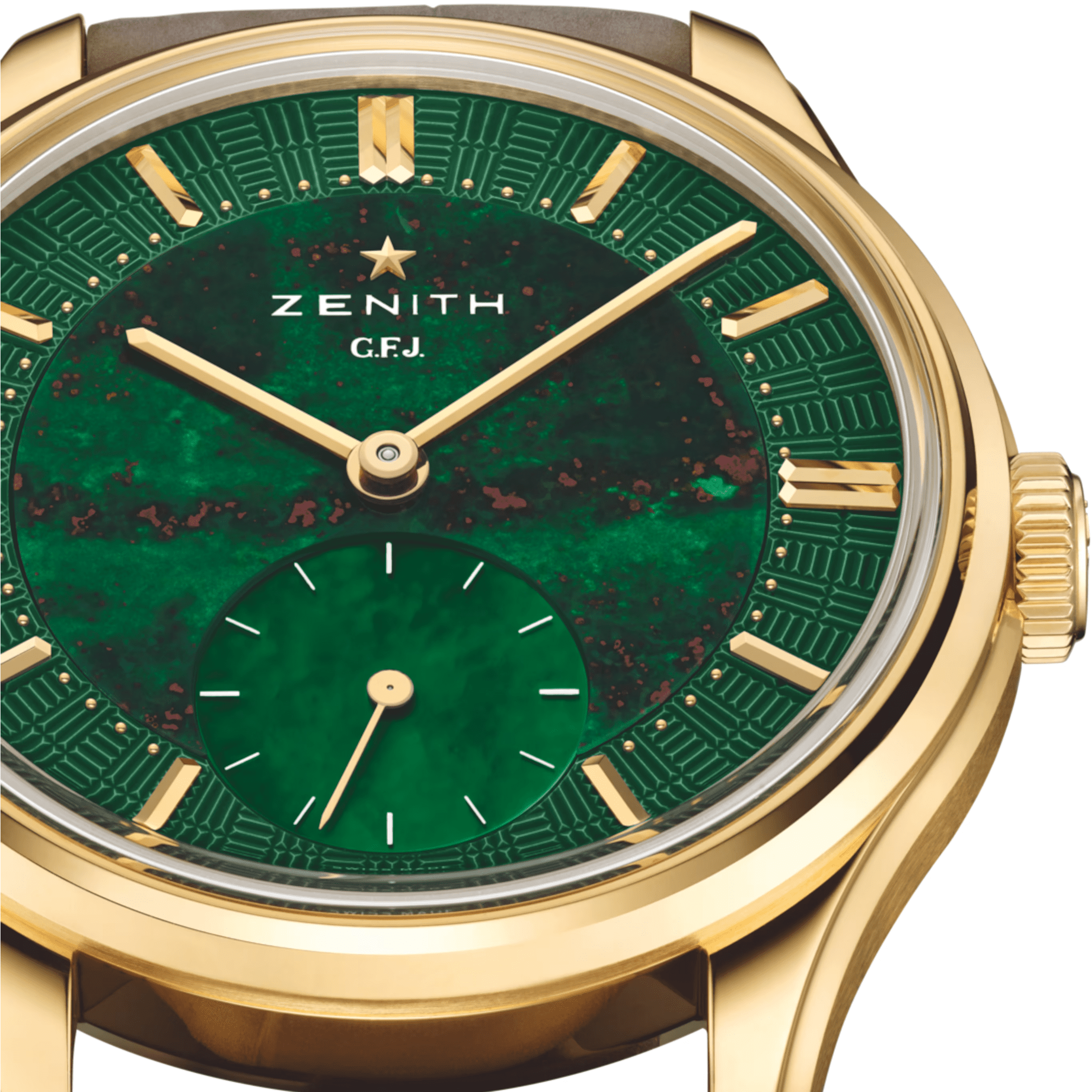 ZENITH G.F.J. CALIBRE 135 Bloodstone Jasper Dial 39mm, 72 Hours Power Reserve, 50m Water Resistance, 18K Yellow Gold, Its dial combines signature brick guilloché on the outer ring with a bloodstone jasper centre and a mother-of pearl small-seconds counter. Includes 3 different leather straps: a beige nubuck alligator strap, a green alligator strap and a black calfskin strap.