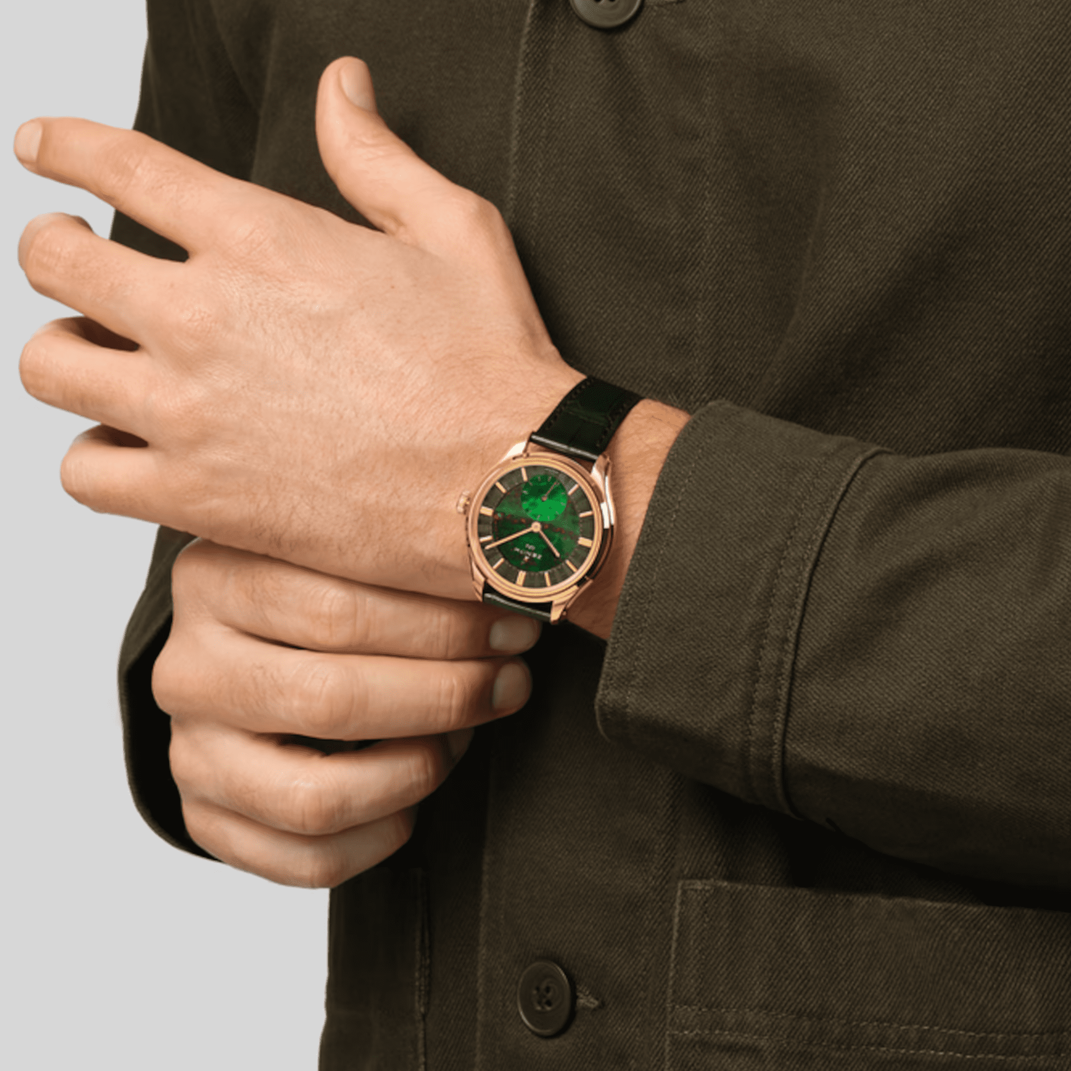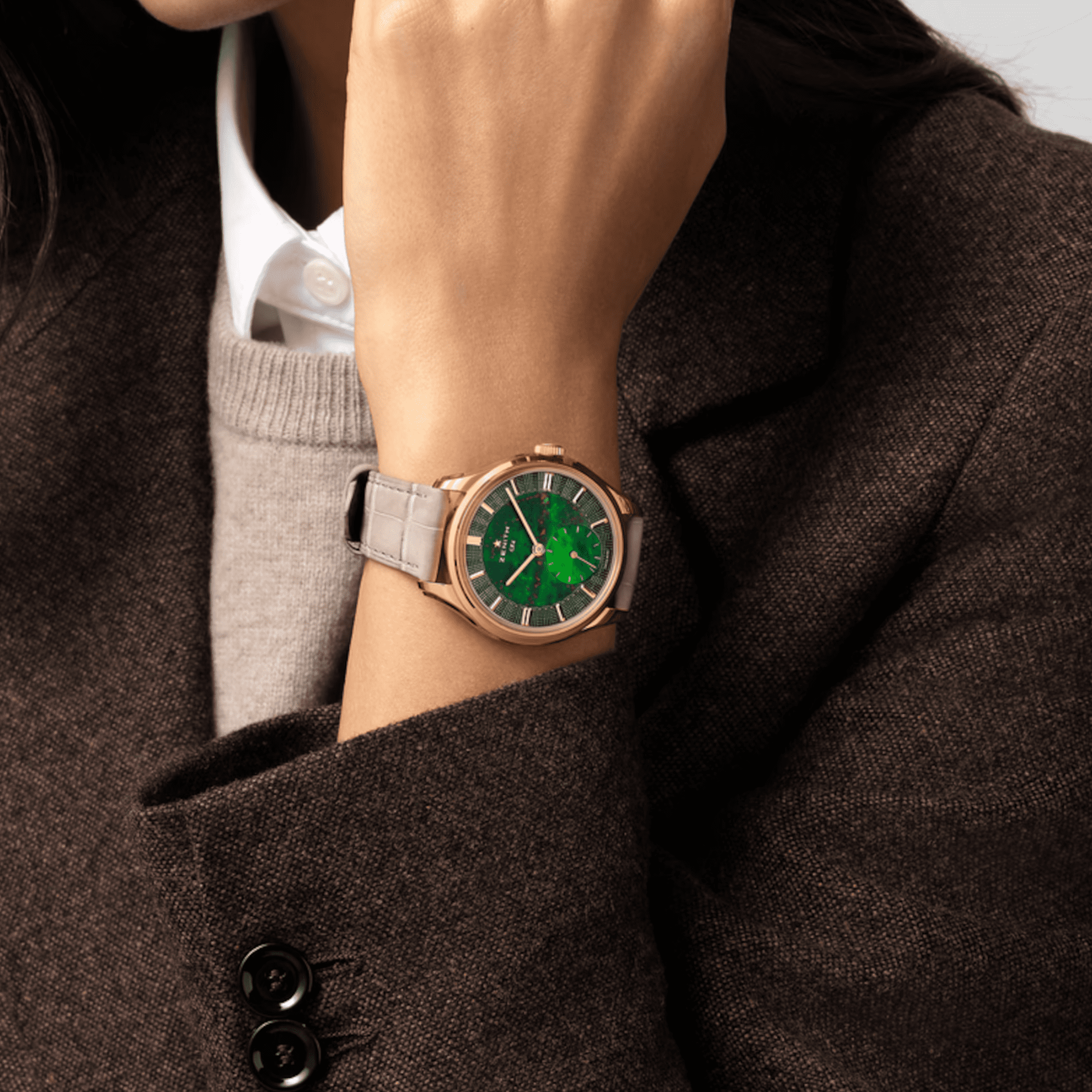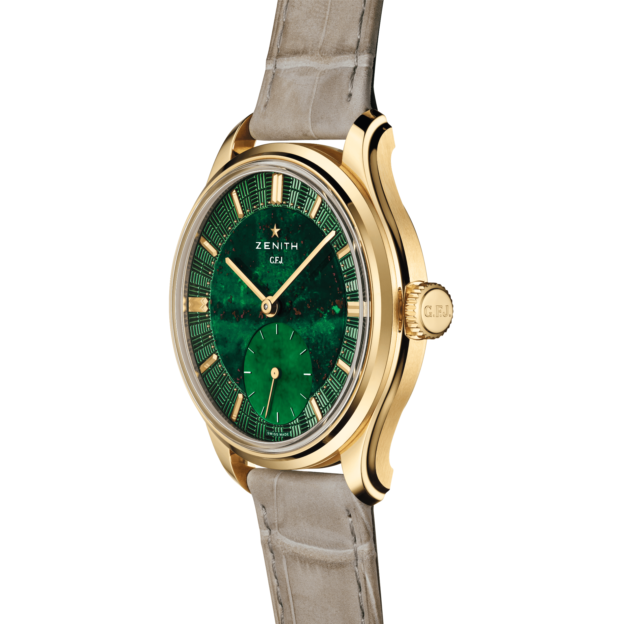 ZENITH G.F.J. CALIBRE 135 Bloodstone Jasper Dial 39mm, 72 Hours Power Reserve, 50m Water Resistance, 18K Yellow Gold, Its dial combines signature brick guilloché on the outer ring with a bloodstone jasper centre and a mother-of pearl small-seconds counter. Includes 3 different leather straps: a beige nubuck alligator strap, a green alligator strap and a black calfskin strap.