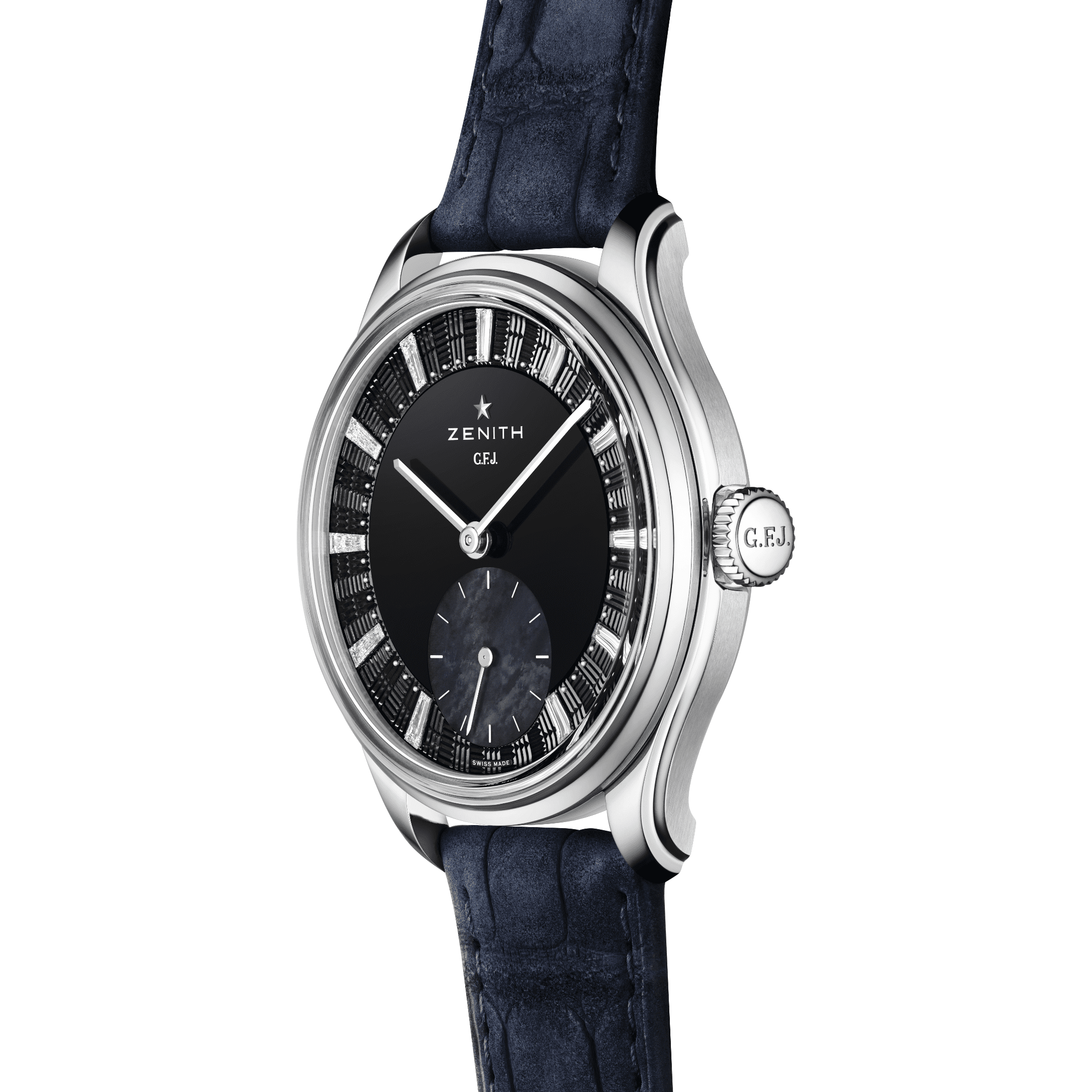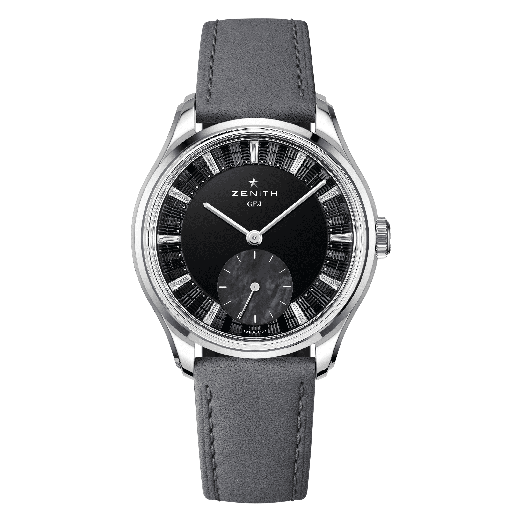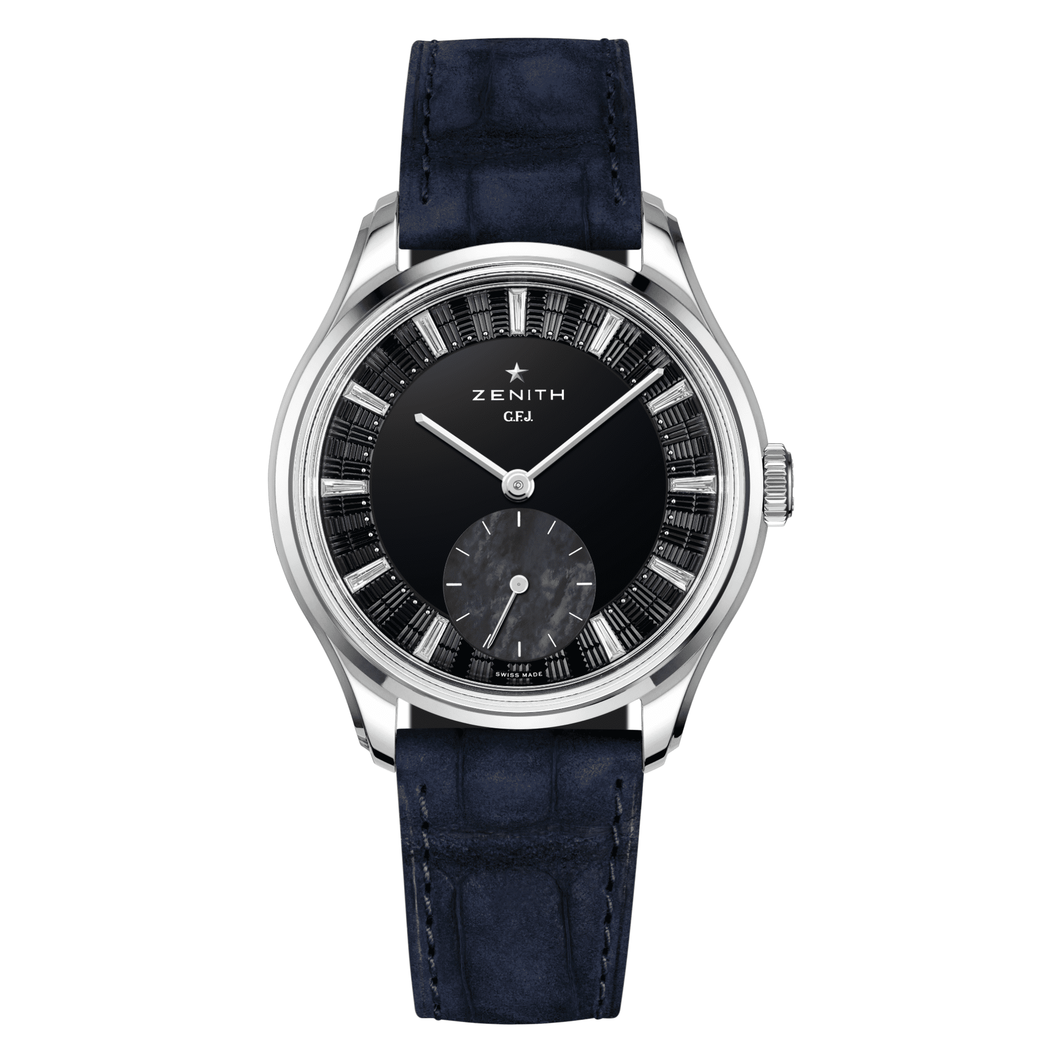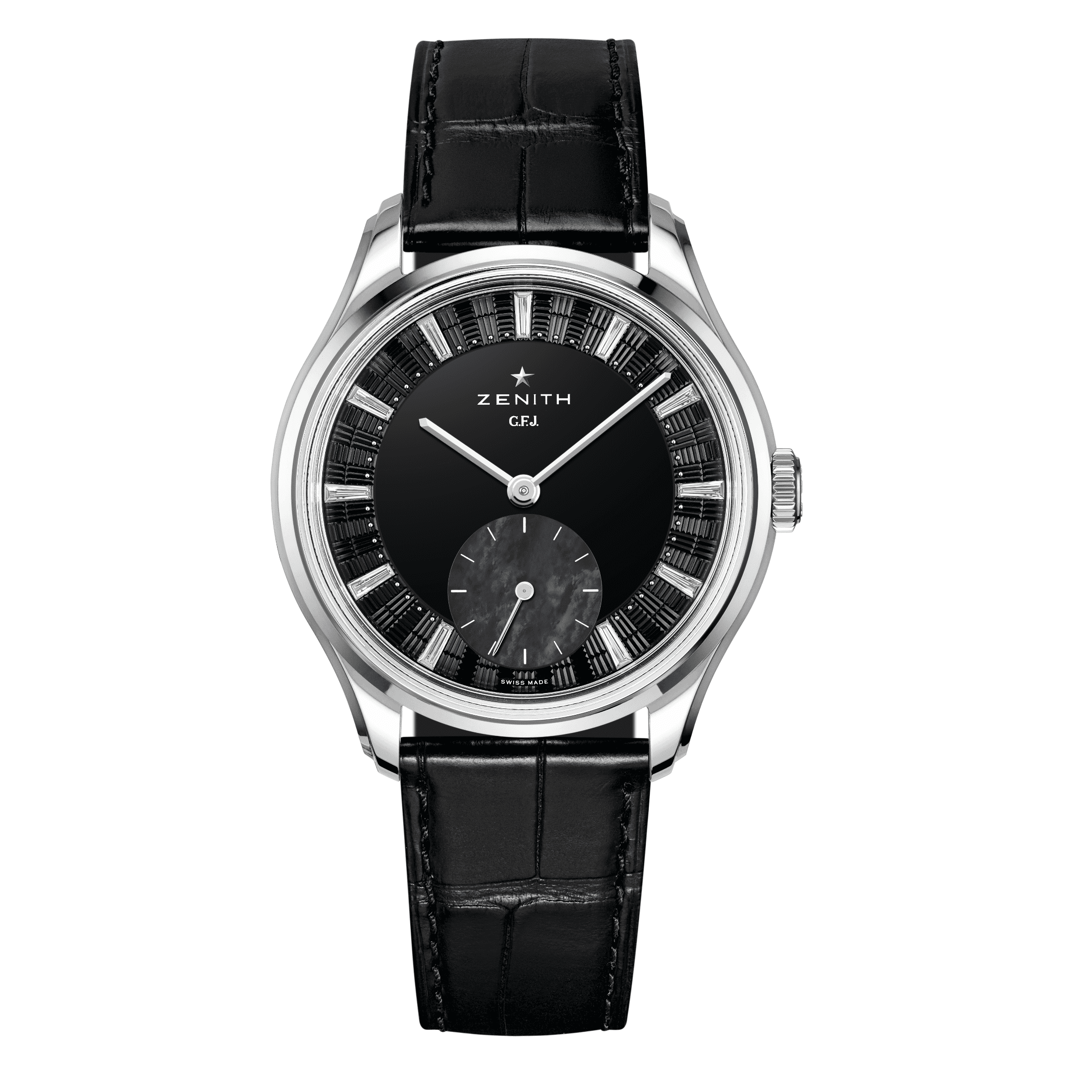 ZENITH G.F.J. CALIBRE 135 Onyx Dial 39mm, Mother of pearl Subdial, 0.45 carats of Baguette cut Diamonds, F-G Color, VS Clarity 72 Hour Power Reserve in Tantalum, Brick motif guilloché with onyx center, Mother-of-pearl subdial & diamonds indexes, Delivered with 3 different straps: a blue nubuck alligator leather strap, a black alligator leather strap and a grey calfskin leather strap.
