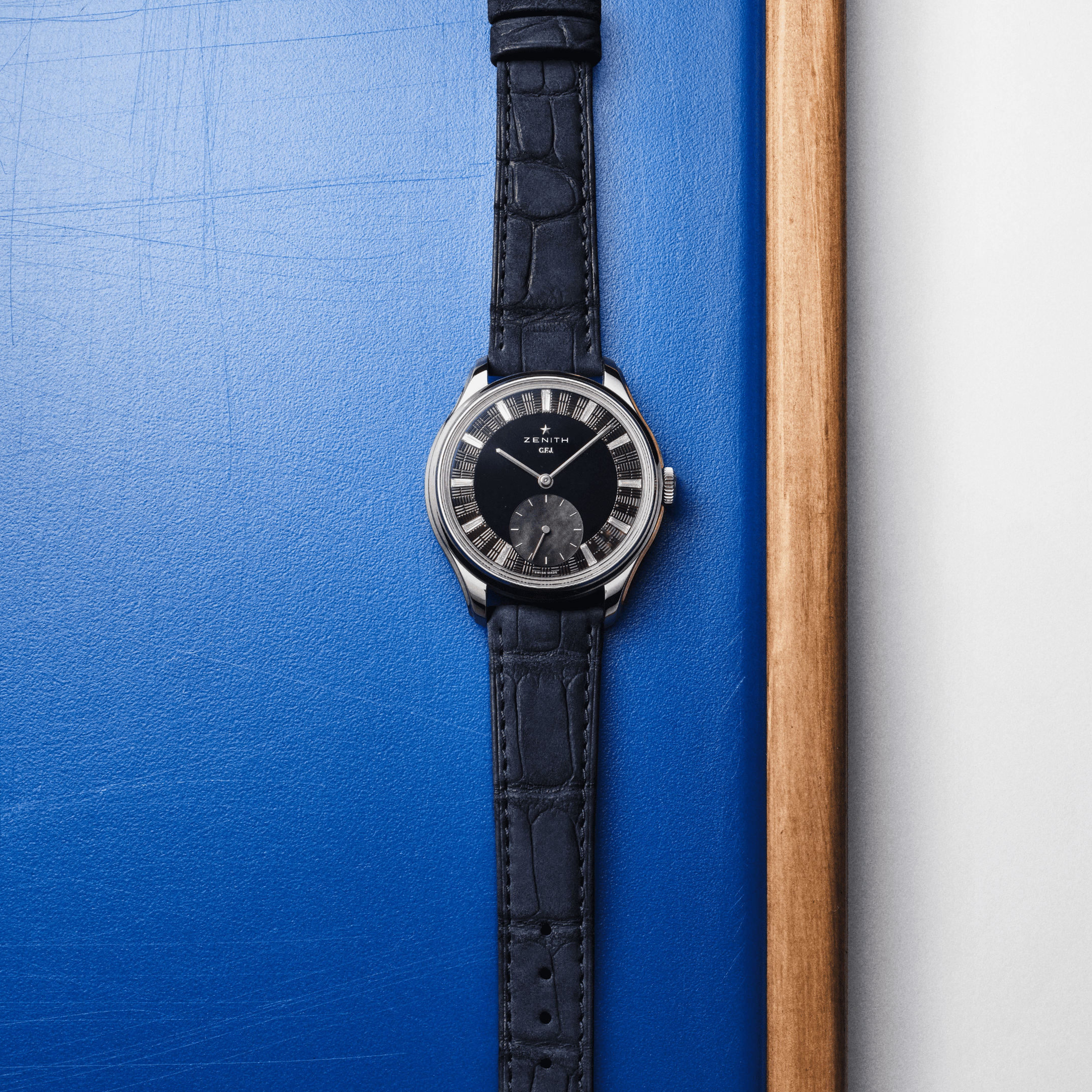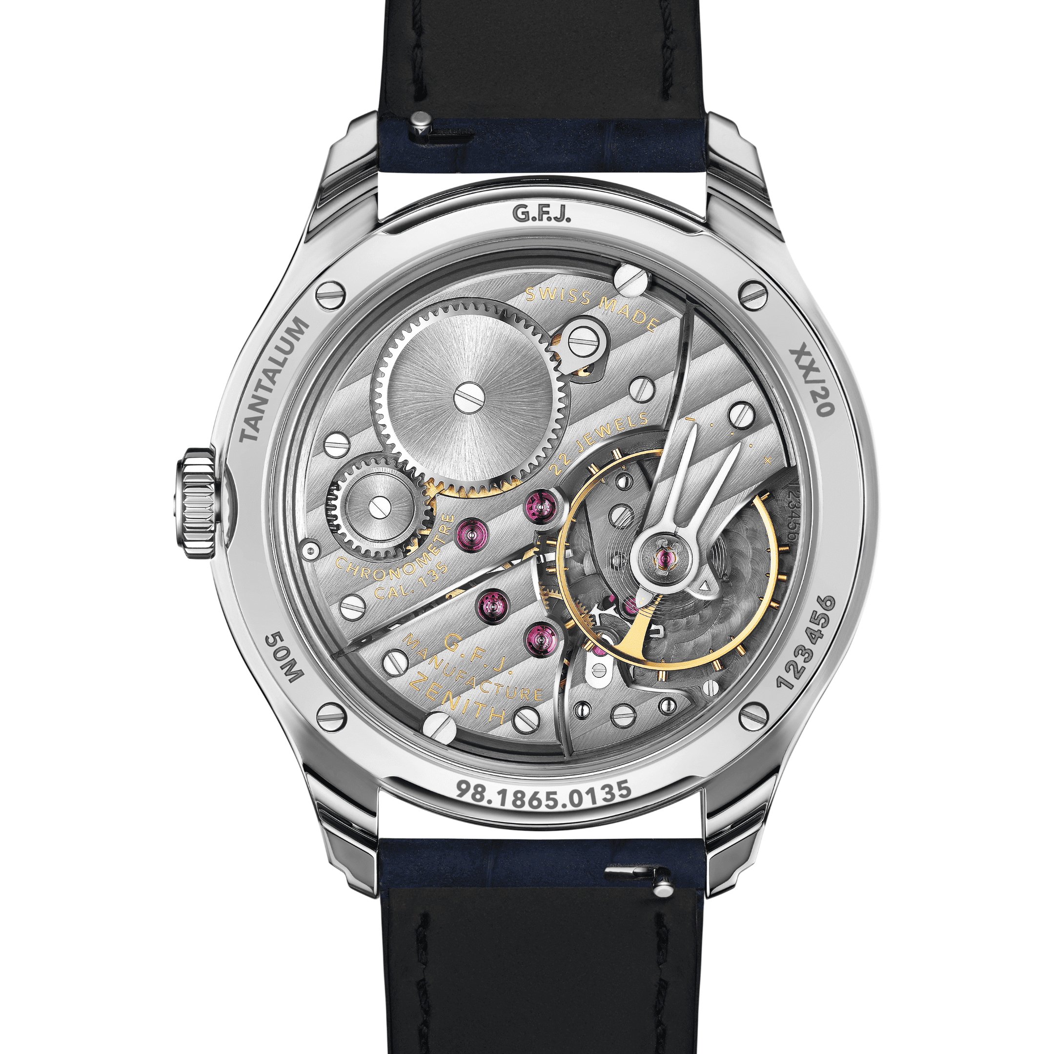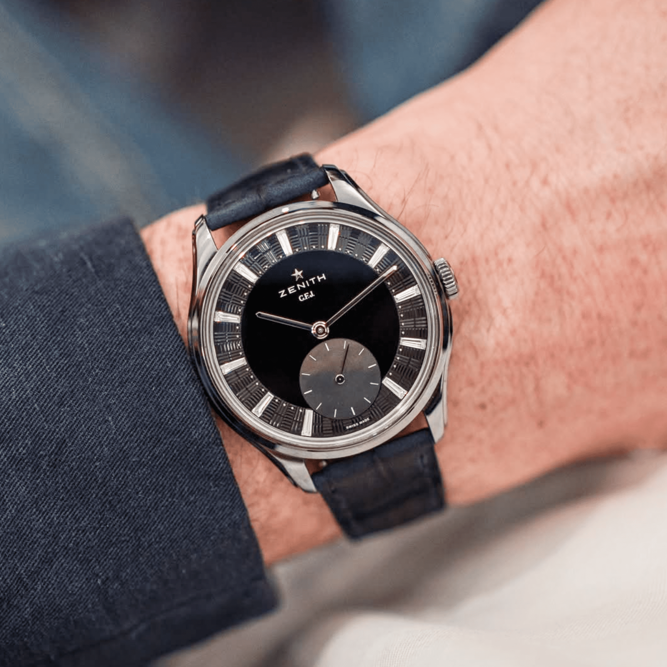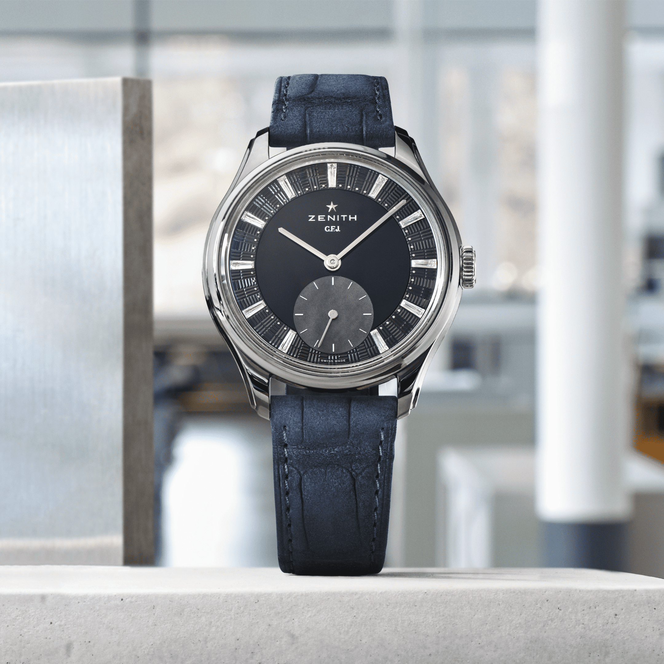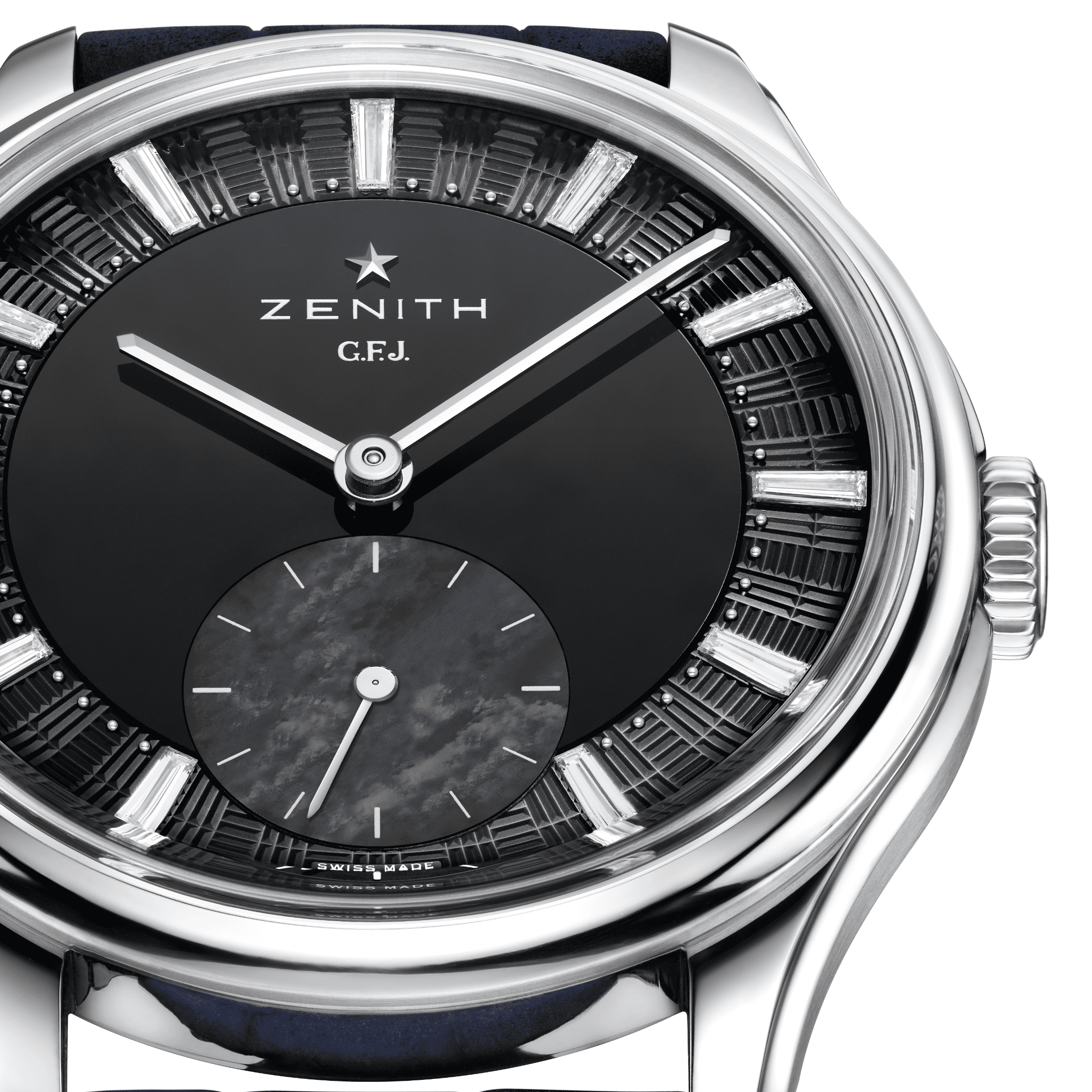 ZENITH G.F.J. CALIBRE 135 Onyx Dial 39mm, Mother of pearl Subdial, 0.45 carats of Baguette cut Diamonds, F-G Color, VS Clarity 72 Hour Power Reserve in Tantalum, Brick motif guilloché with onyx center, Mother-of-pearl subdial & diamonds indexes, Delivered with 3 different straps: a blue nubuck alligator leather strap, a black alligator leather strap and a grey calfskin leather strap.