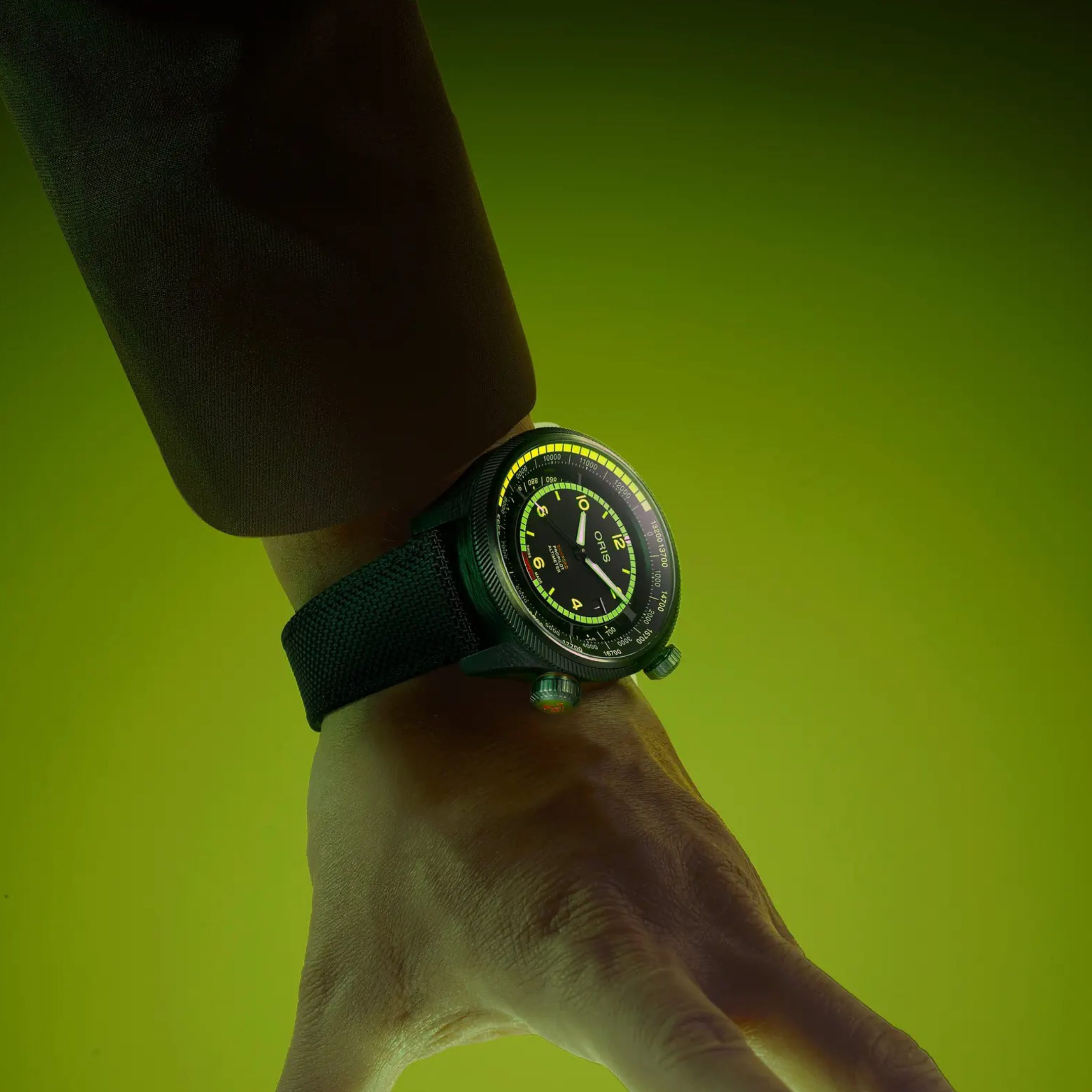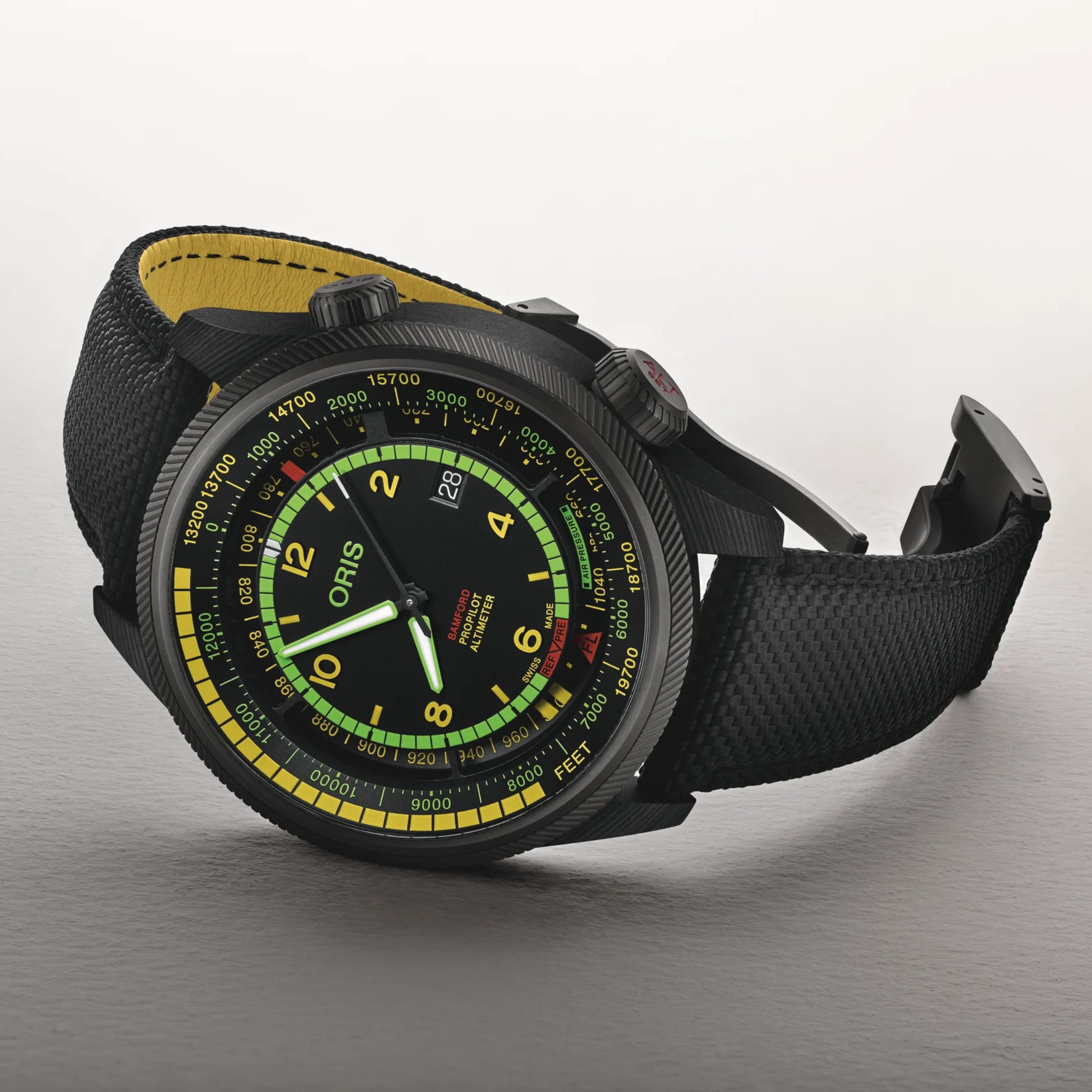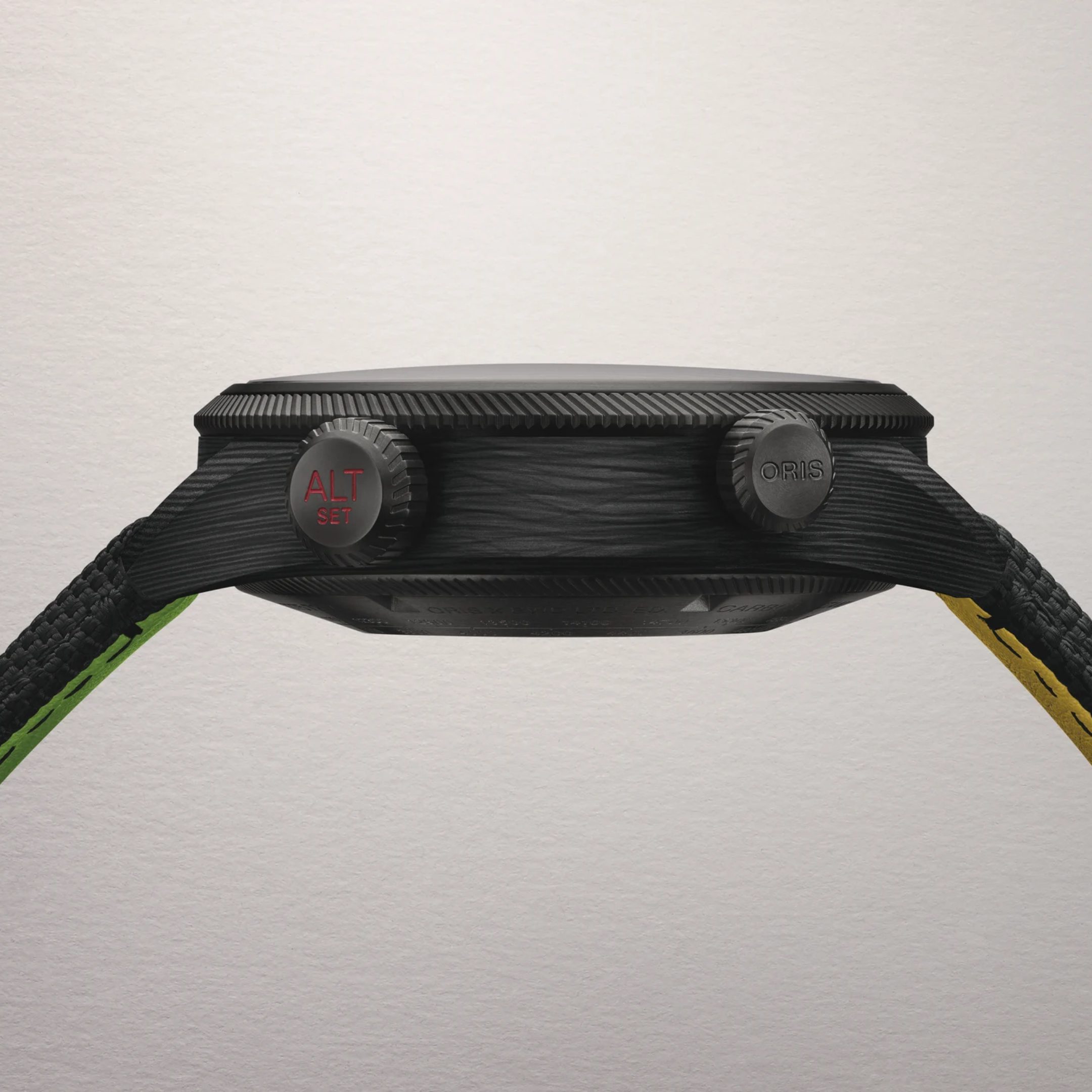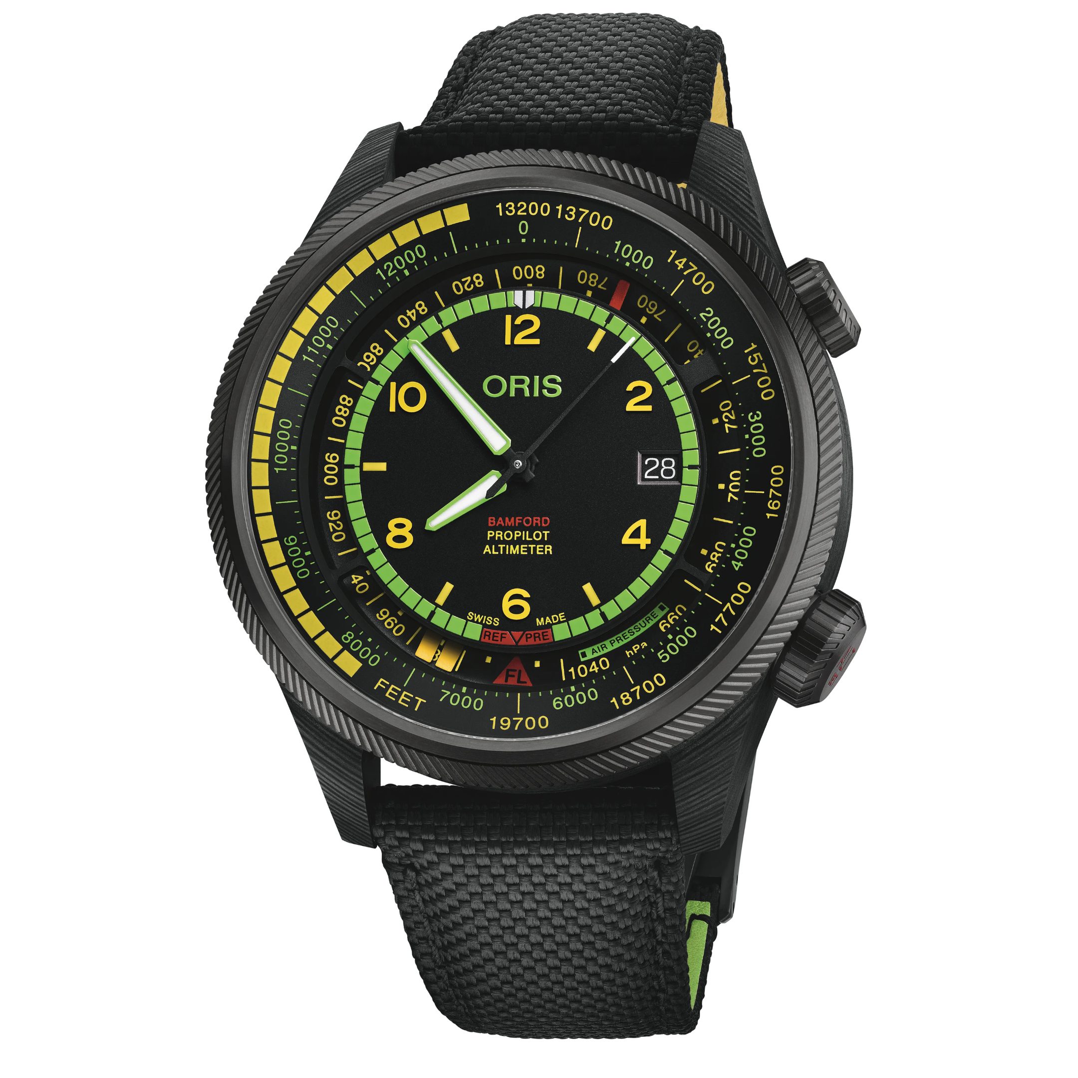 Oris x Bamford Watch Department Limited Edition ‘Mission Control’, a watch created in collaboration with London’s BWD. They added a colourful, spacey twist to our ProPilot Altimeter, the ultimate pilot’s watch. ProPilot Altimeter is the world’s only automatic watch with a built-in mechanical altimeter that can measure and display air pressure and altitude. 47mm Black Dial, 100m Water Resistance, Centre hands for hours, minutes and seconds, date window, instantaneous date, date corrector, fine timing device and stop-second, Caliber 793-1, 56 Hours Power Reserve, Special box, limited to 250 pieces.