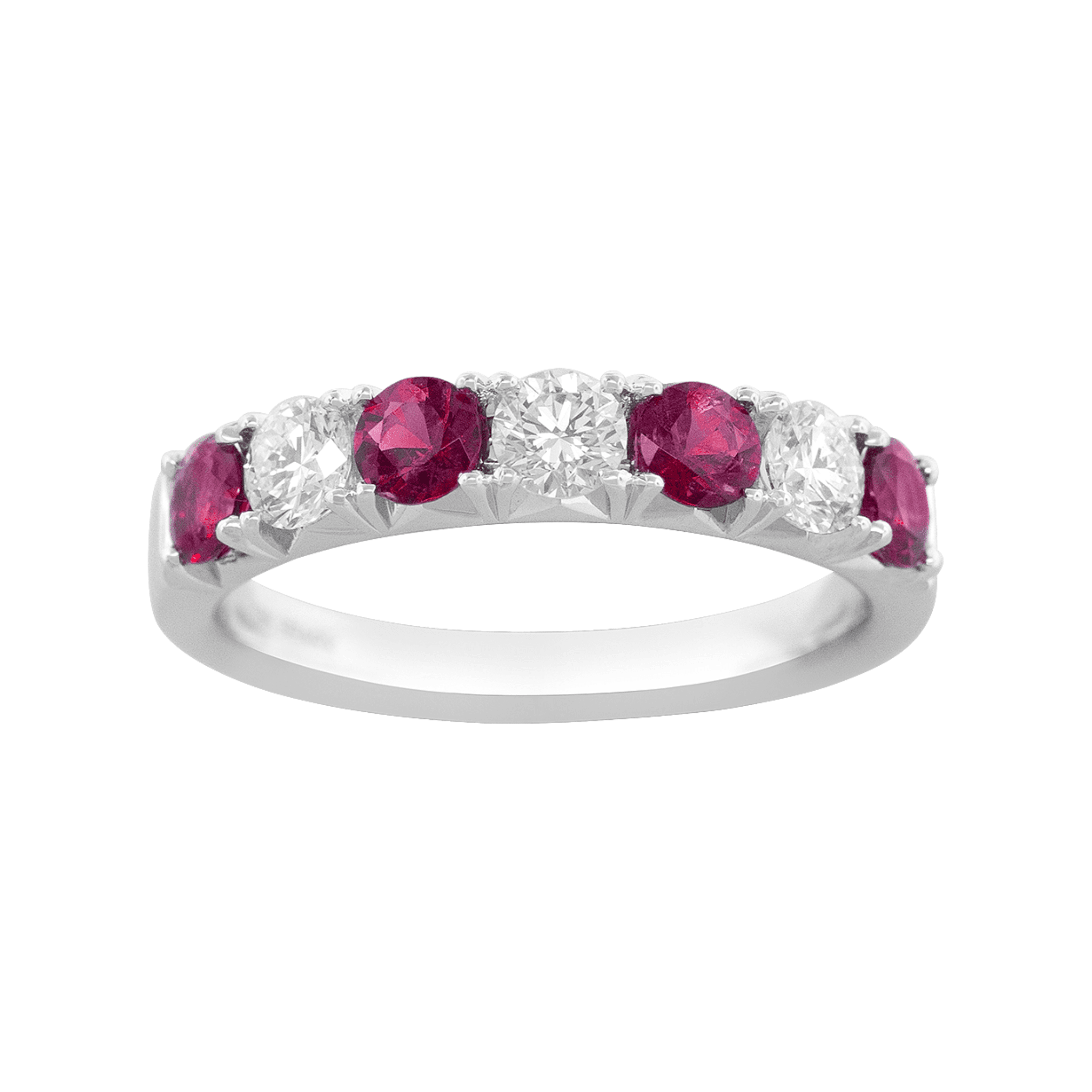Classic ruby and diamond band from Spark Creations. This ring contains .80 carats of even red, brilliant rubies that are prong-set with .51 carats of round, brilliant diamonds. The ring is set with 18K white gold.