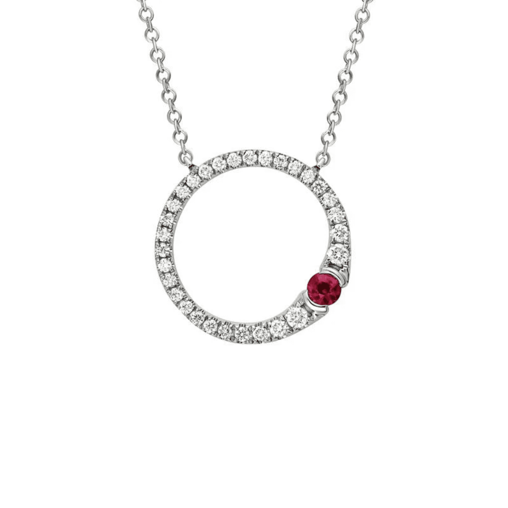 Ruby off-set Diamond Circle Stationary Pendant Necklace in White Gold