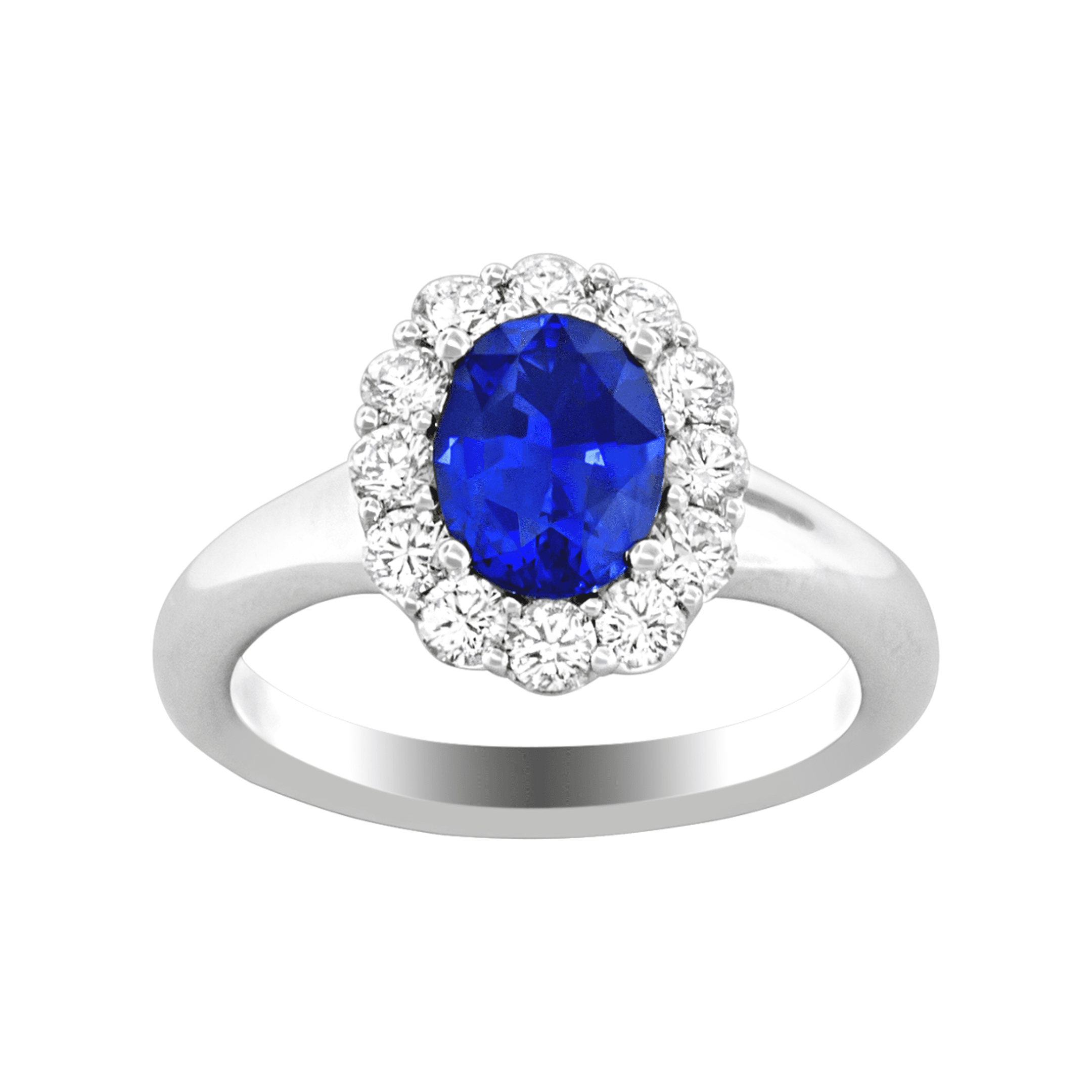 Spark Creations Sapphire and Diamond “Halo” ring in 18K White Gold. This ring is prong-set with a 1.45 Carat Oval Sapphire outlined by 0.60 Carats of Round Diamonds (G Color / VS2 Clarity). This ring is 3.00mm wide and is made in size 6.50.
