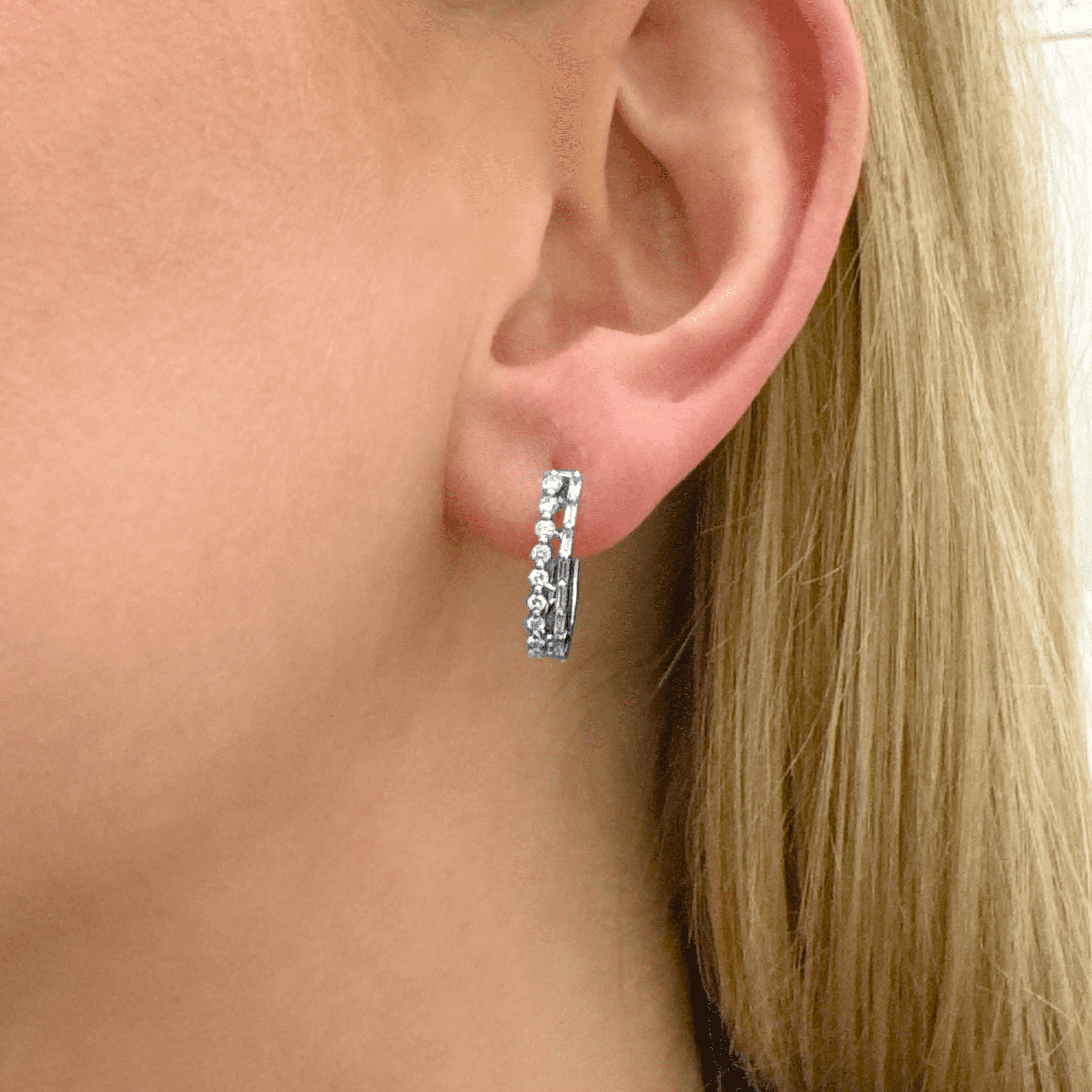 Marshall Pierce and Company Chicago Two Row Huggie Earrings with 18 Round Diamonds Weighing 0.32 Carats, And 16 Baguette Diamonds With A Total Weight Of 0.16 Carats all G color and VS Clarity set in 18K White Gold
