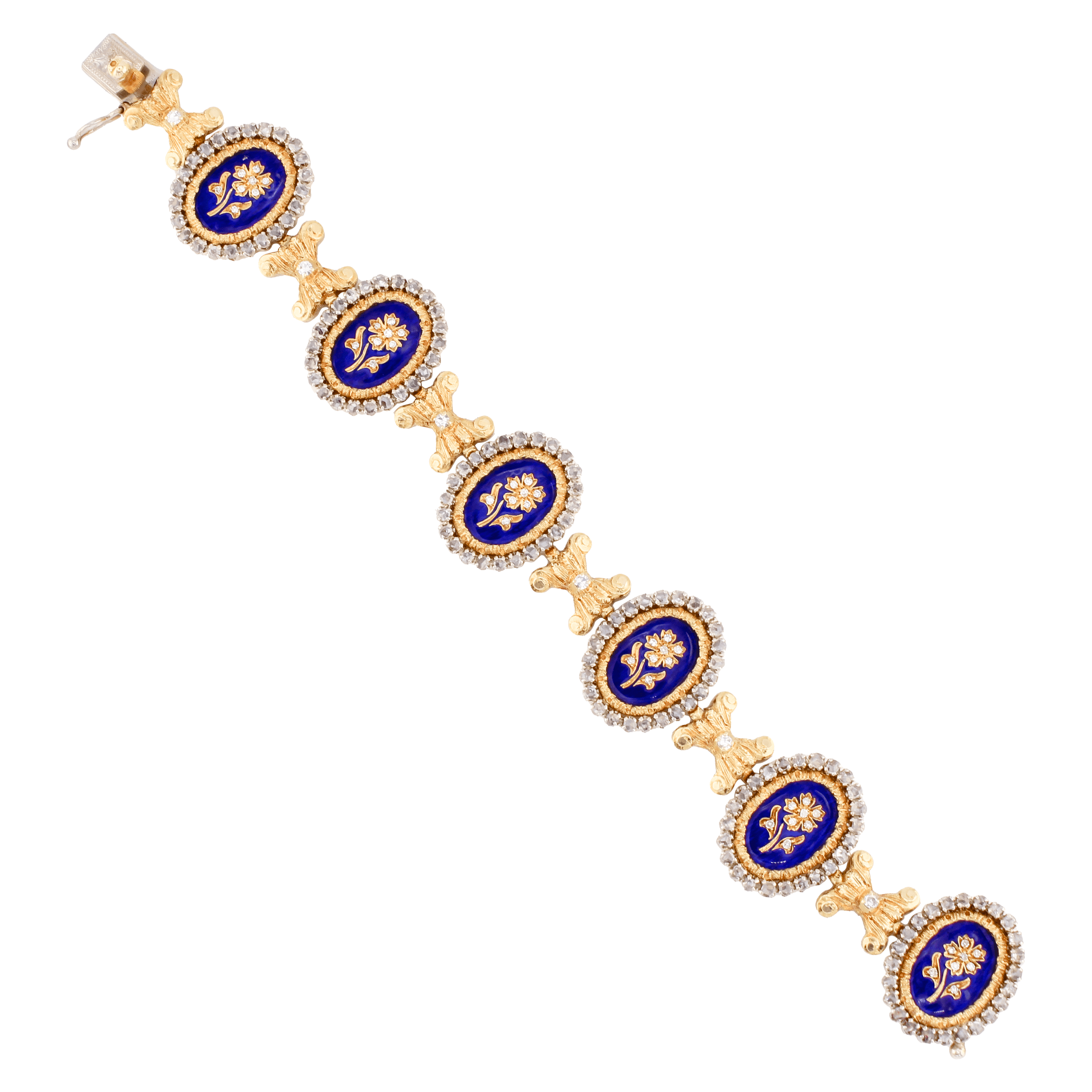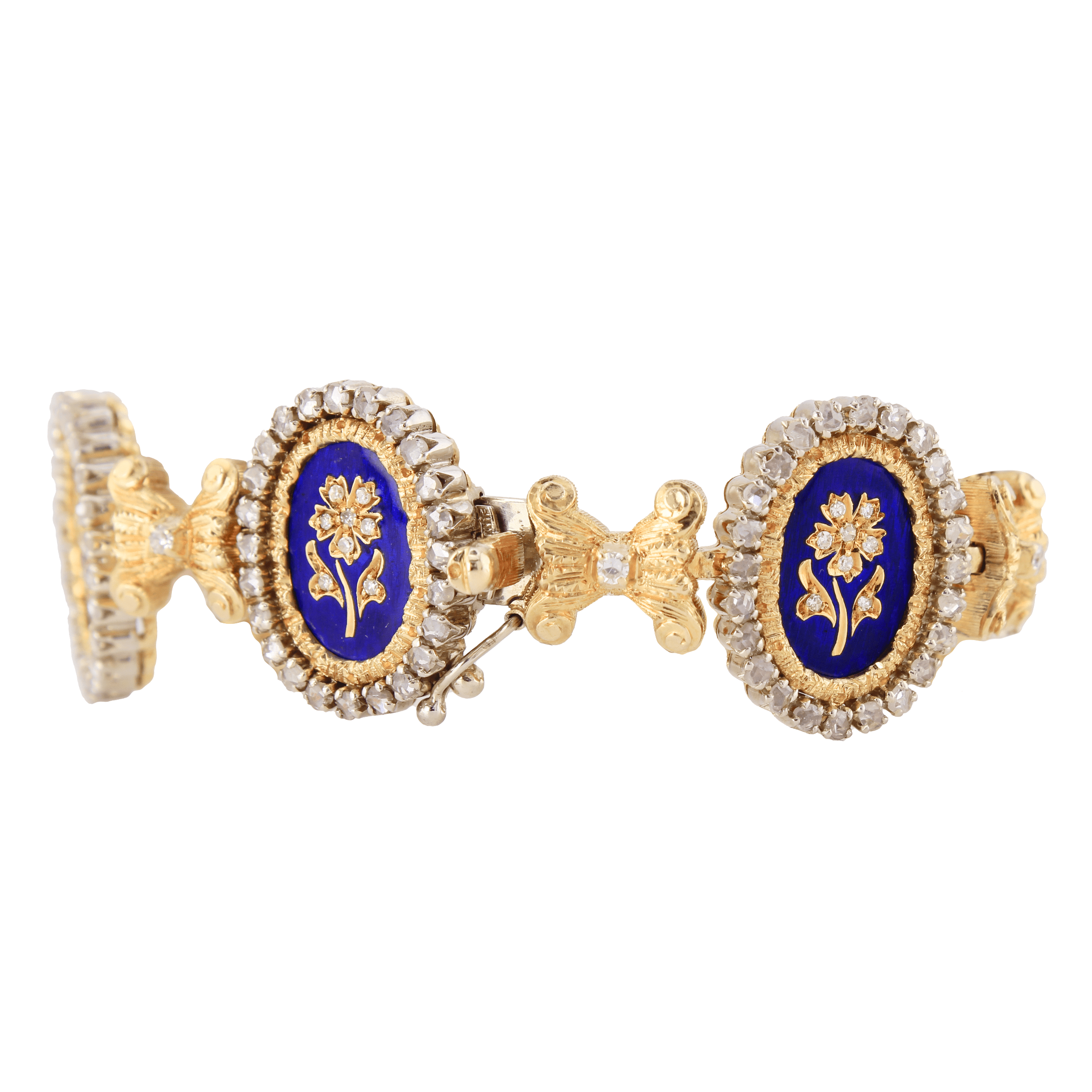 Vintage Old Mine cut Diamonds and Blue Enamel Bracelet in Yellow Gold