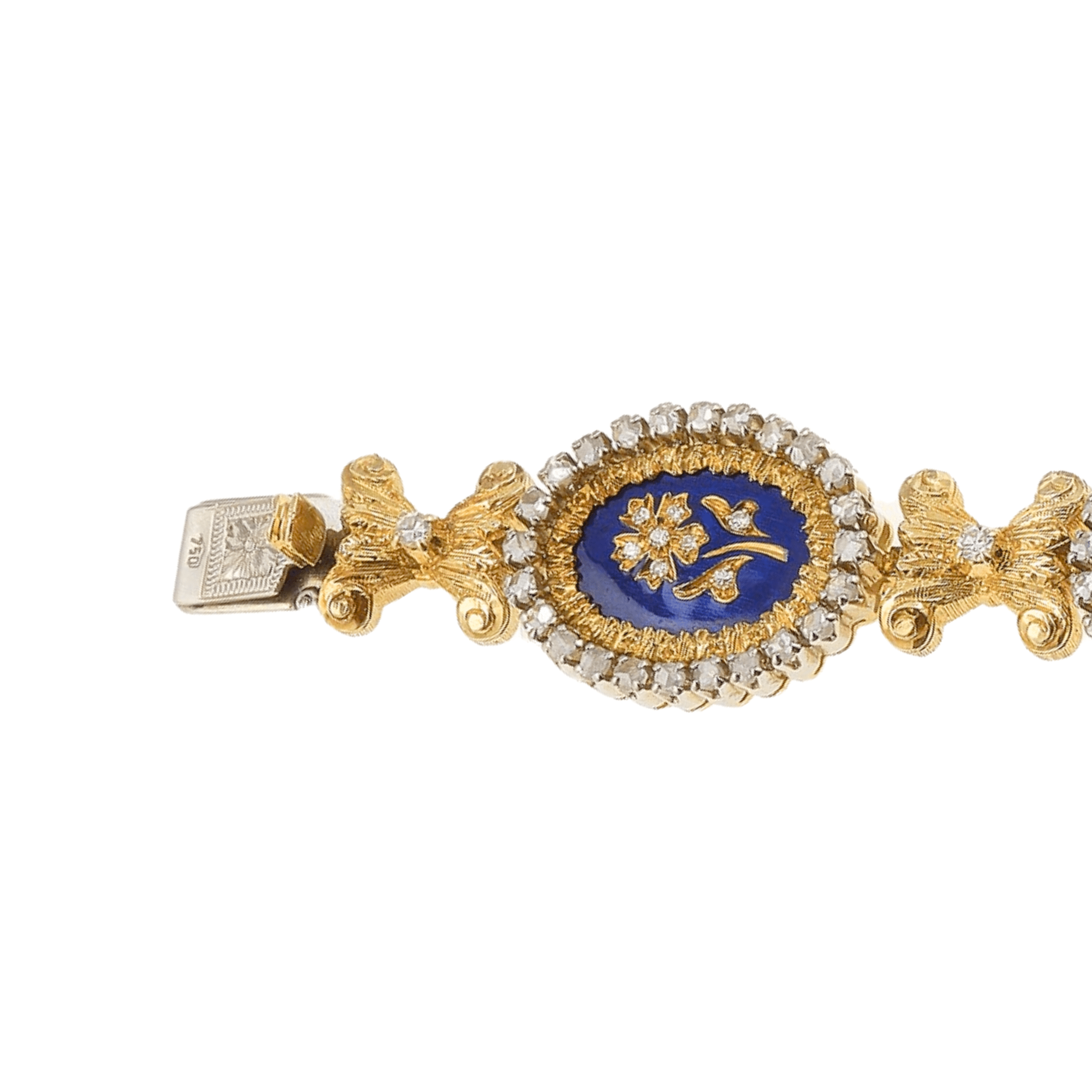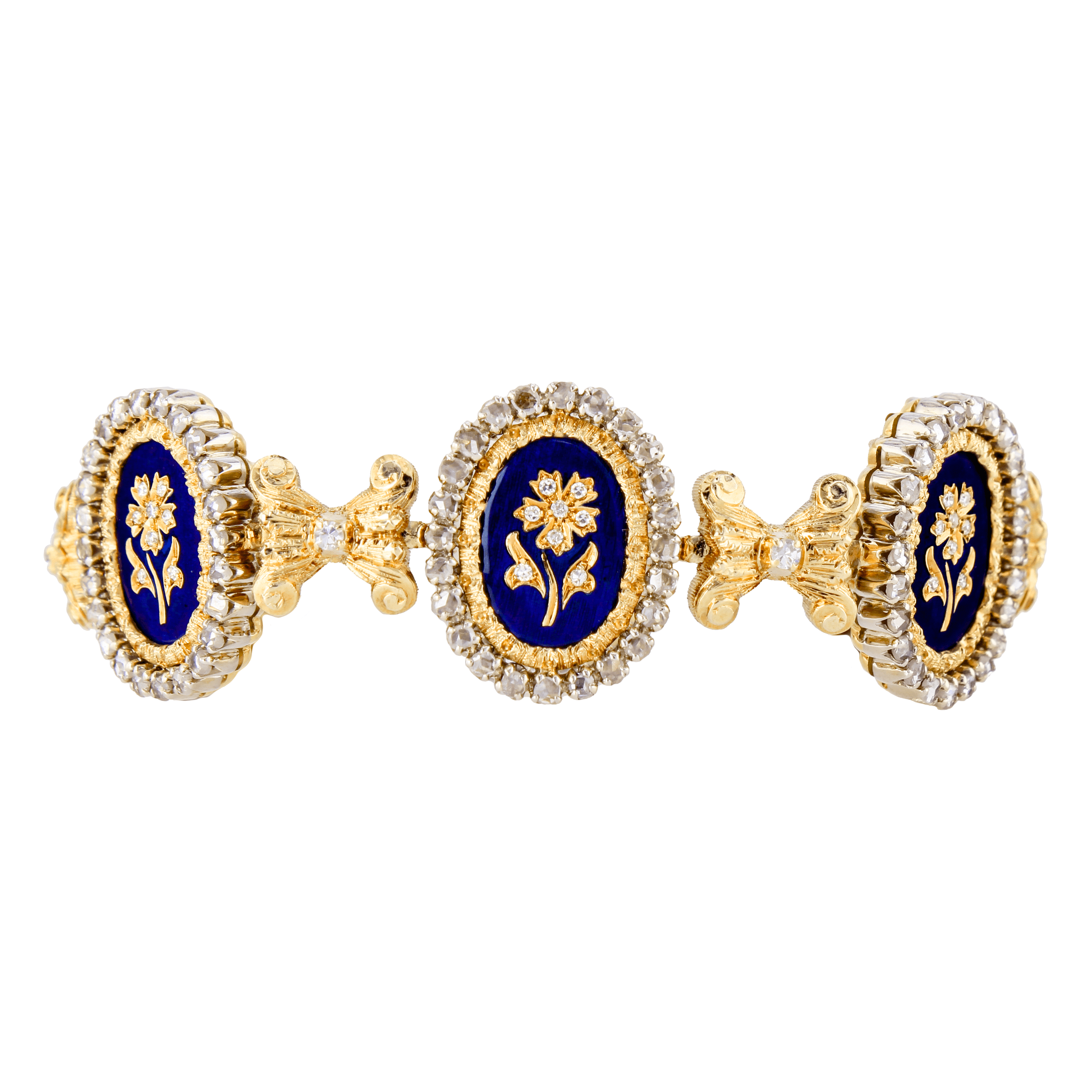 Marshall Pierce and Company Chicago curated Vintage Old Mine cut Diamonds and Blue Enamel Bracelet in 18K Yellow Gold