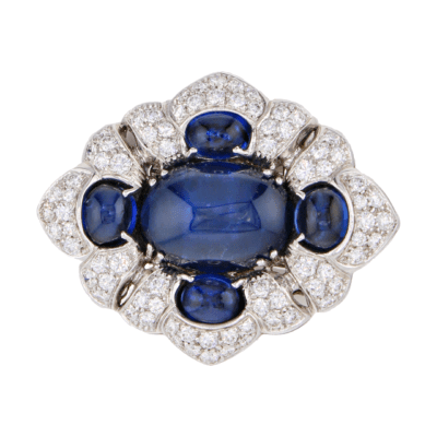 Estate Jewelry28.07 carat Cabochon Blue Sapphire and 2.19 carat Diamond Brooch in White Gold